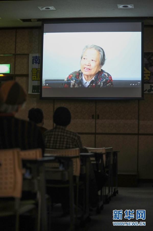 12月13日,人們在日本東京舉行的紀(jì)念南京大屠殺83周年集會現(xiàn)場觀看南京大屠殺幸存者石秀英的講述紀(jì)錄片。新華社記者 杜瀟逸 攝