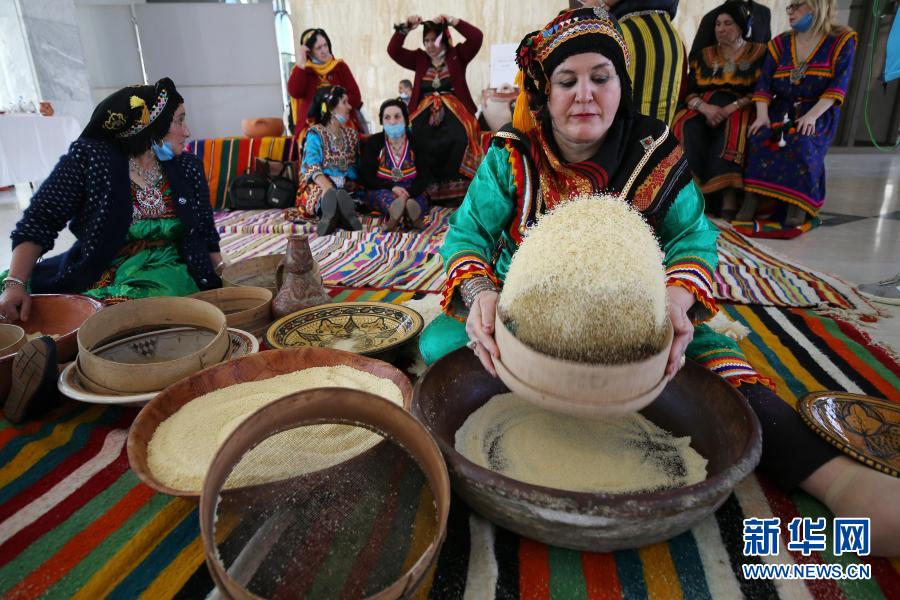 12月17日,在阿爾及利亞首都阿爾及爾,柏柏爾婦女在一個(gè)文化活動(dòng)上制作“古斯古斯”。