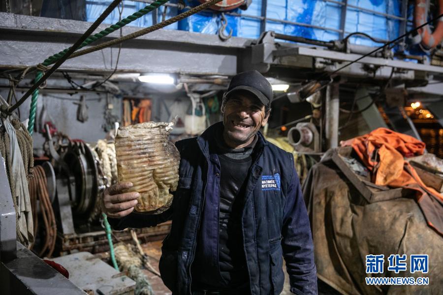 12月17日,在希臘比雷埃夫斯地區(qū)一處港口,一名漁民展示自己收集的塑料垃圾。新華社發(fā)(萊夫特里斯·帕察里斯攝)