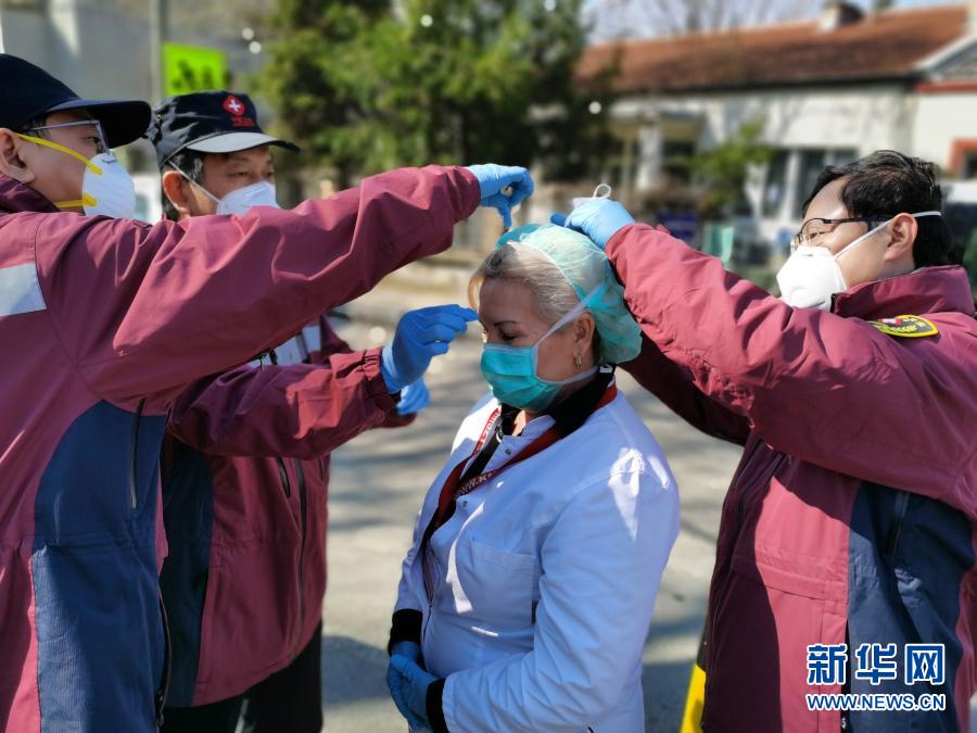 4月4日,中國赴塞爾維亞抗疫醫(yī)療專家組在貝爾格萊德的基層發(fā)熱門診走訪時,幫助塞爾維亞醫(yī)生特里富諾維奇(中)佩戴高標(biāo)準(zhǔn)的防護口罩。新華社發(fā)