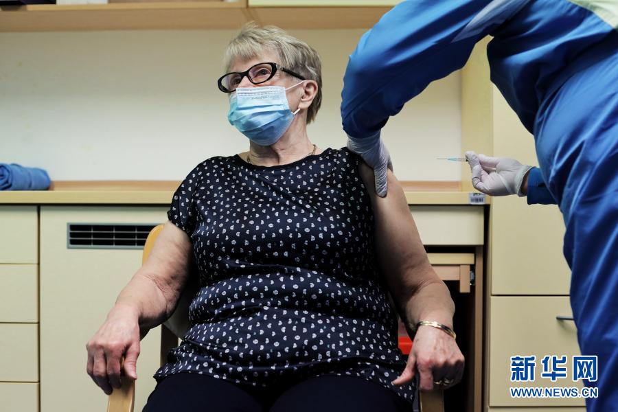 12月27日,在斯洛文尼亞首都盧布爾雅那一家養(yǎng)老院,醫(yī)務(wù)人員為一名志愿者老人注射新冠疫苗。
