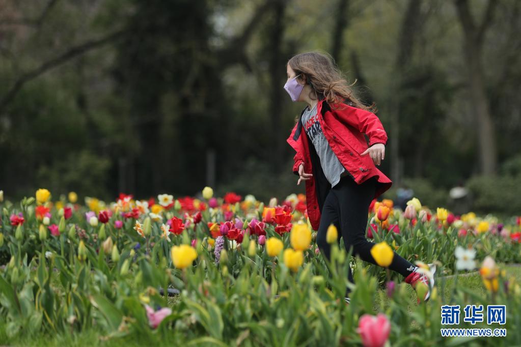 4月14日,一名小女孩在比利時布魯塞爾以西的拜加登城堡的花叢中奔跑。