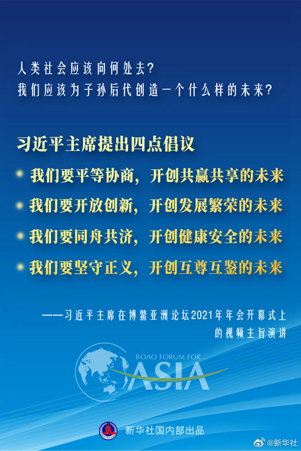 博鰲亞洲論壇2021年年會(huì)開幕式20日上午在海南博鰲舉行,國(guó)家主席習(xí)近平以視頻方式發(fā)表主旨演講。面對(duì)“人類社會(huì)應(yīng)該向何處去?我們應(yīng)該為子孫后代創(chuàng)造一個(gè)什么樣的未來(lái)?”這一重大命題,習(xí)近平主席提出四點(diǎn)倡議。