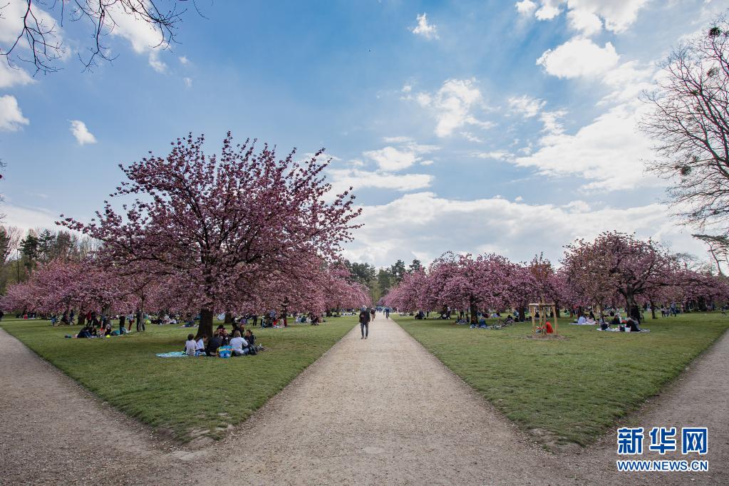 4月20日,人們?cè)诜▏屠杞嫉膰t公園欣賞櫻花。