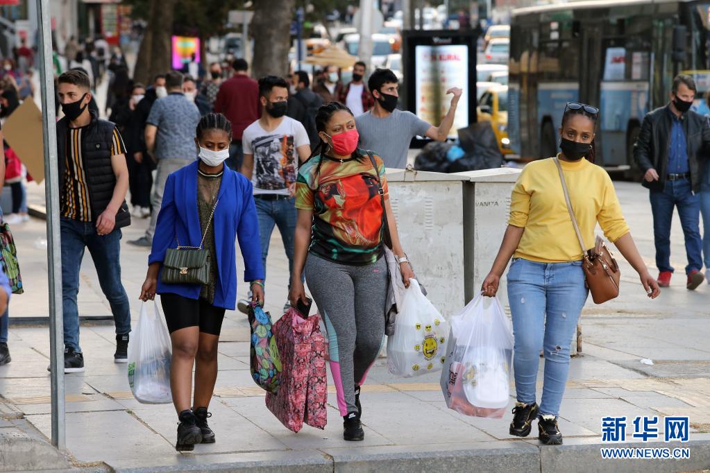 4月29日禁令實(shí)施前,人們戴口罩在土耳其安卡拉購(gòu)物。