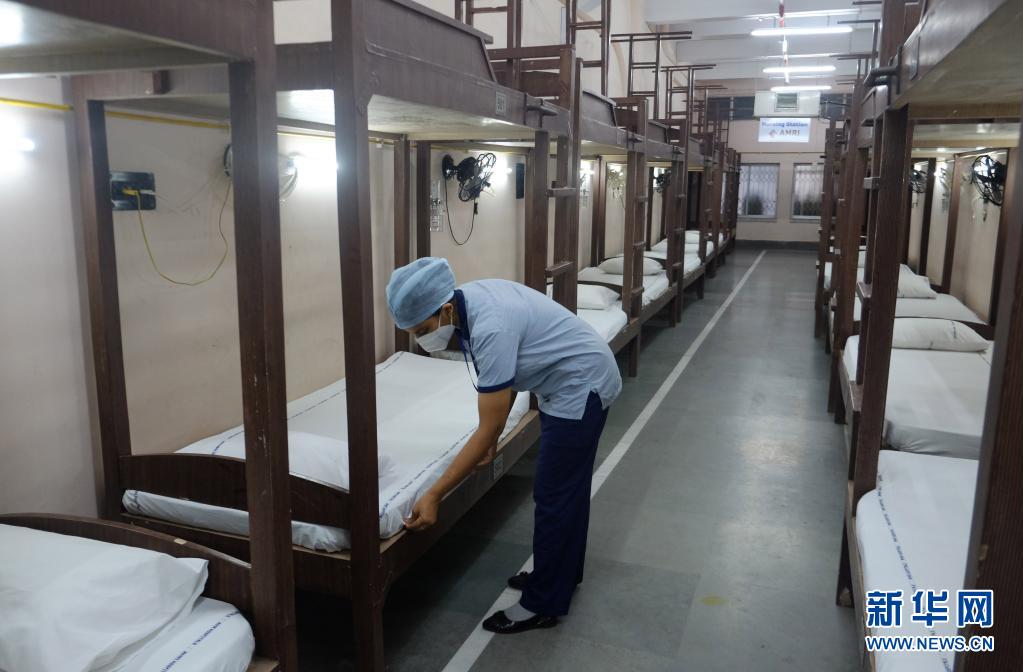 5月6日,工作人員在印度加爾各答一處被改造成新冠隔離中心的足球場(chǎng)內(nèi)整理床鋪。