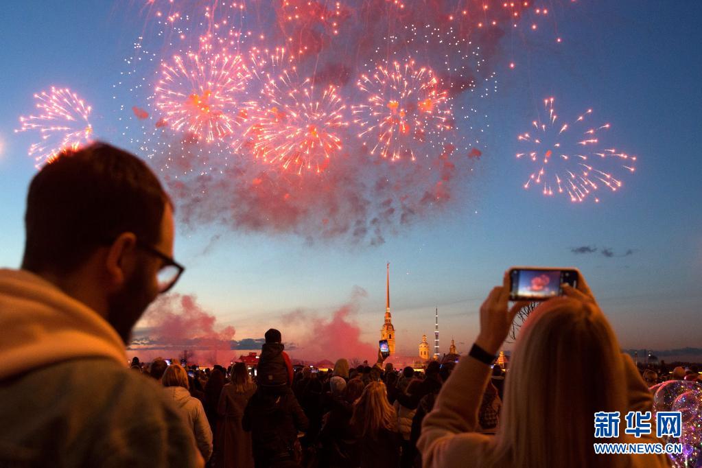 當(dāng)日,俄羅斯圣彼得堡燃放煙花,紀(jì)念衛(wèi)國戰(zhàn)爭勝利76周年。