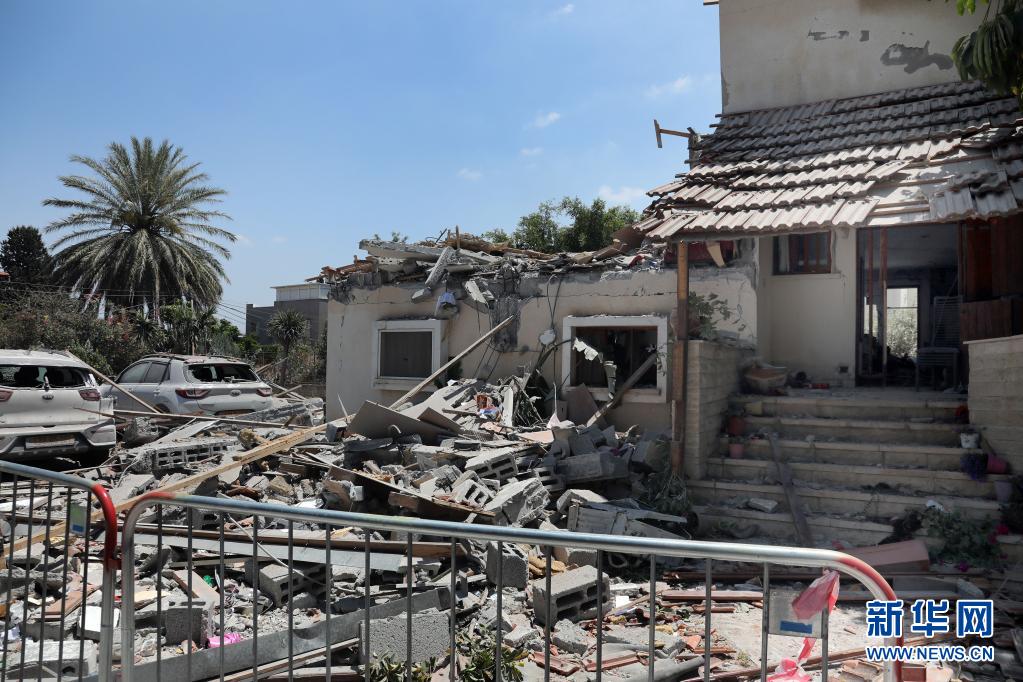 這是5月13日在以色列中部城市耶胡德拍攝的被火箭彈擊中損毀的房屋。