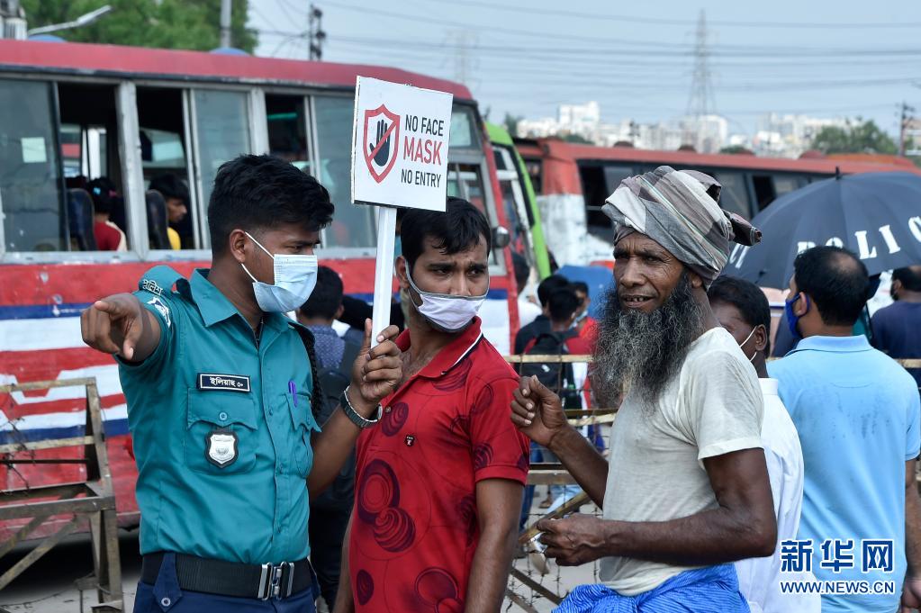 5月17日,警察在孟加拉國(guó)首都達(dá)卡的車站手舉佩戴口罩的提示牌,要求從各地返回達(dá)卡的人們注意防護(hù)安全。