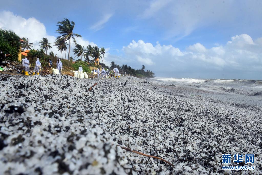 5月27日,安全人員在距離科倫坡30多公里的斯里蘭卡西海岸城市尼甘布清理被海水沖到這里的集裝箱船“X-PRESS PEARL”的碎片。