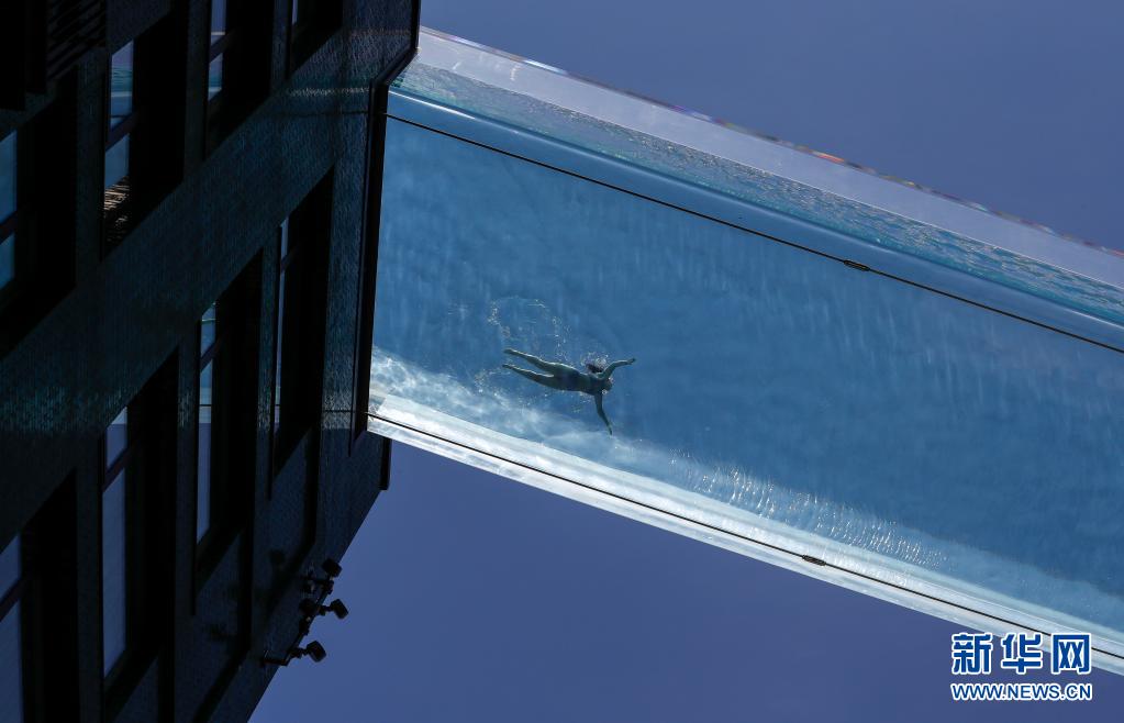 6月2日,一名女子在英國倫敦南部一個(gè)建造于兩棟公寓樓之間的“空中泳池”游泳。
