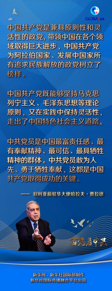 新華社大馬士革6月3日電(記者汪健 鄭一晗)敘利亞前駐華大使哈拉夫·賈拉德日前在大馬士革接受新華社記者專訪時(shí)說,中國(guó)共產(chǎn)黨是兼具原則性和靈活性的政黨,帶領(lǐng)中國(guó)在各個(gè)領(lǐng)域取得巨大進(jìn)步,“中國(guó)共產(chǎn)黨為阿拉伯國(guó)家、發(fā)展中國(guó)家所有追求民族解放的政黨樹立了榜樣”。