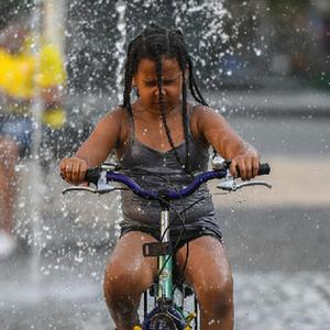 6月17日,在德國(guó)法蘭克福,一名小朋友騎車穿過噴泉納涼。