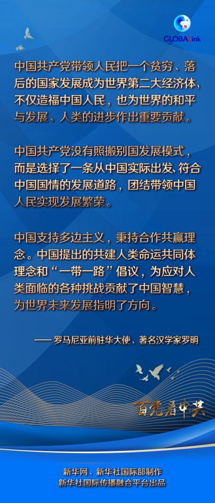 新華社布加勒斯特6月19日電(記者林惠芬 陳進(jìn))羅馬尼亞前駐華大使、著名漢學(xué)家羅明日前在布加勒斯特接受新華社記者專訪時(shí)表示,中國(guó)共產(chǎn)黨帶領(lǐng)人民把一個(gè)貧窮、落后的國(guó)家發(fā)展成為世界第二大經(jīng)濟(jì)體,不僅造福中國(guó)人民,也為世界的和平與發(fā)展、人類的進(jìn)步作出重要貢獻(xiàn)。