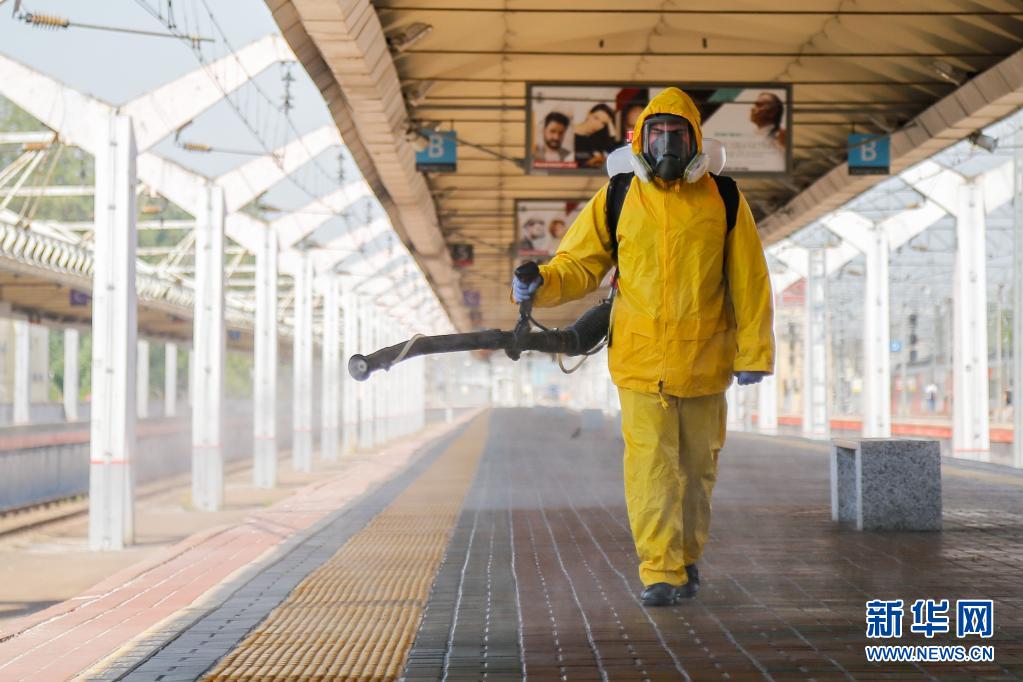 6月24日,工作人員身著防護服在俄羅斯莫斯科一個火車站進行消毒作業(yè)。