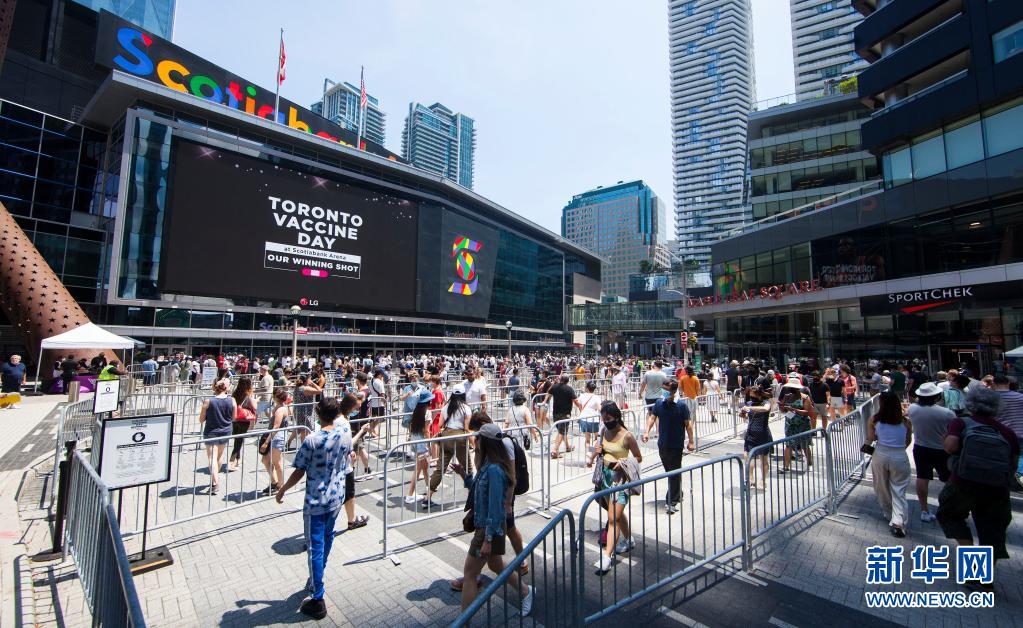 6月27日,在加拿大多倫多,人們排隊(duì)進(jìn)入大型新冠疫苗接種中心。