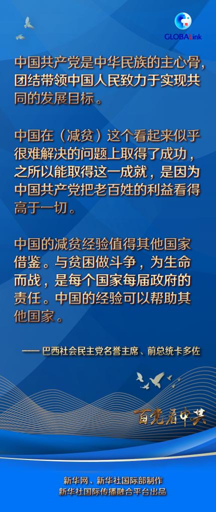 卡多佐說,他曾幾次訪問中國,中國的發(fā)展給他留下了深刻印象。他稱贊中國共產(chǎn)黨領(lǐng)導(dǎo)下的中國在減少貧困方面取得巨大成就。